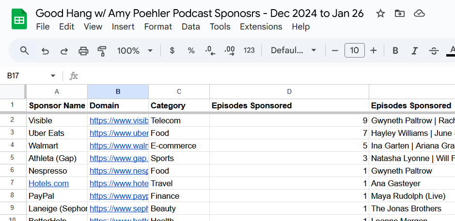 This week, we scanned every episode published on Good Hang with Amy Poehler in the last one year to find sponsor data. We tracked every single brand that put money into this podcast's host read ads.